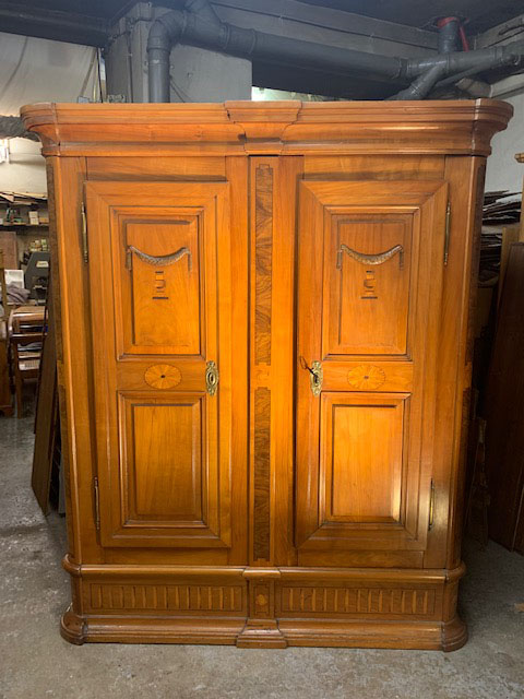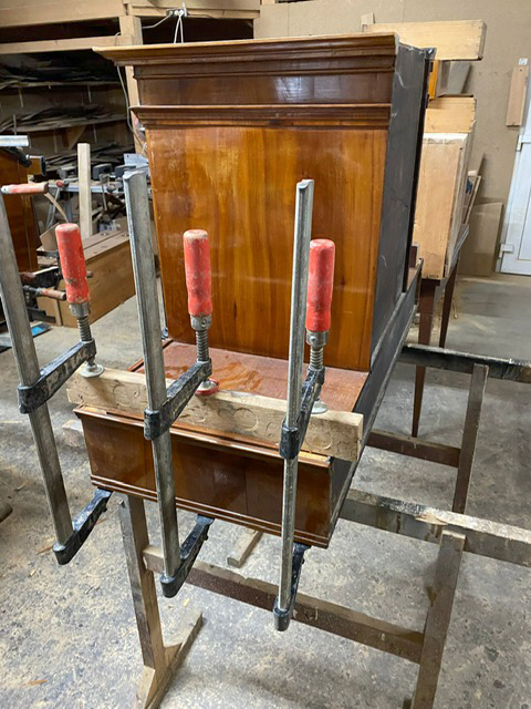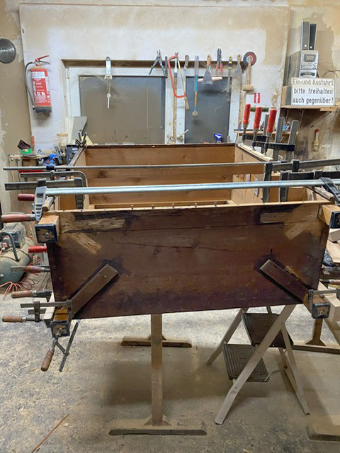 Lose Furniere oder Holzteile werden vorsichtig gelöst und durch Einlagen aus alten Hölzern oder Furnieren möglichst aus der gleichen Epoche ersetzt und mit Knochenleim neu verleimt.